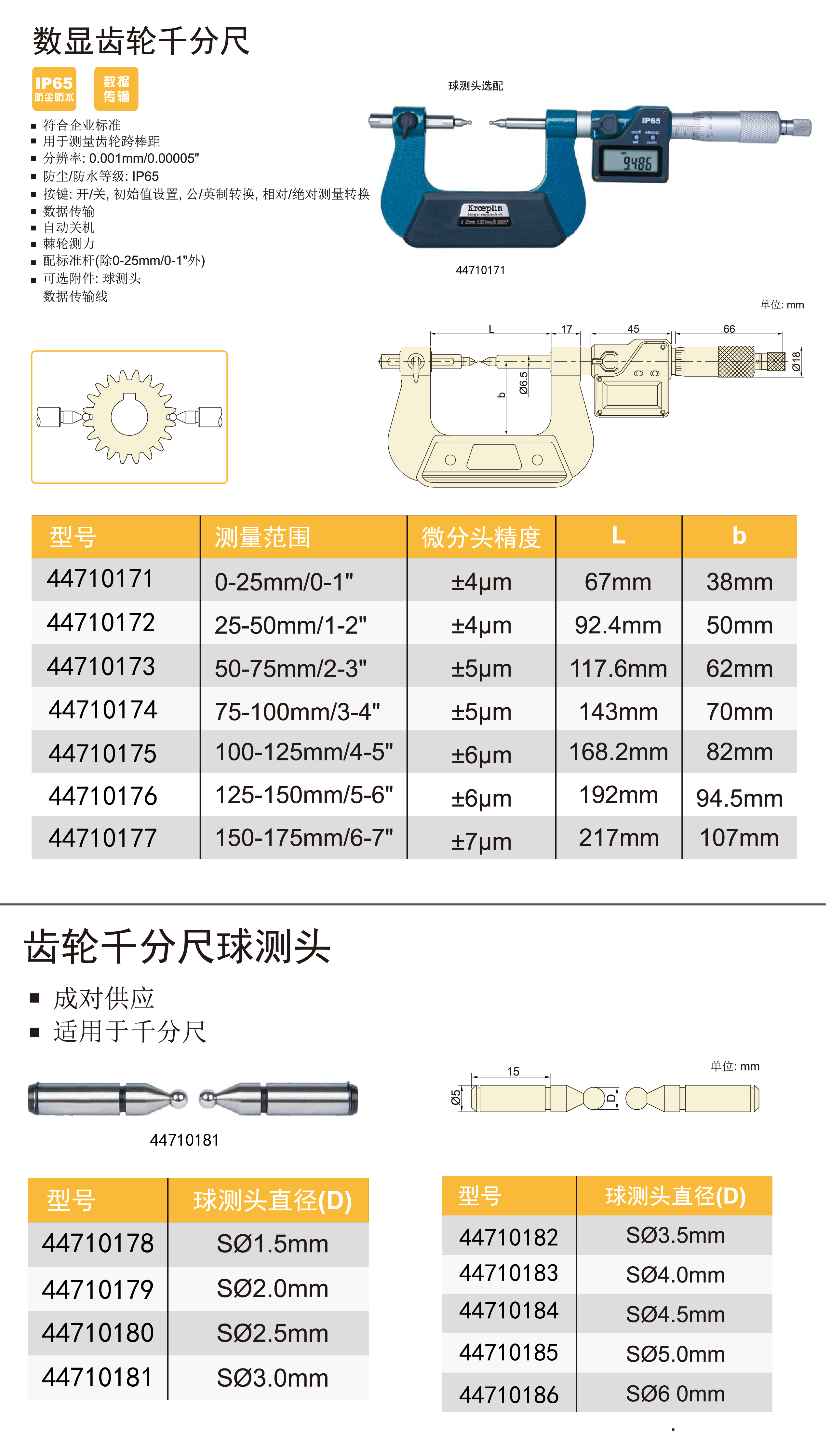 数显齿轮千分尺44710171由kroeplin(凯普林)品牌制造,具有以下特点: