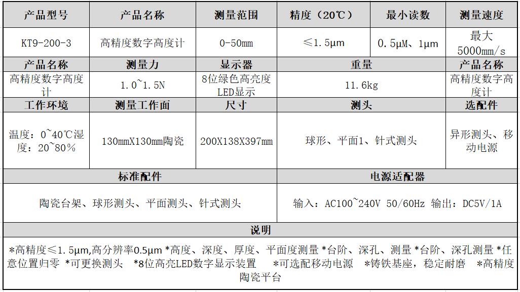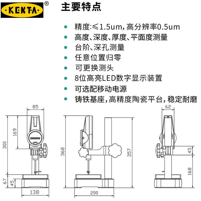 KENTA(克恩达) KT9-200-3 数字式机械测头单柱测高仪具有以下特点:
