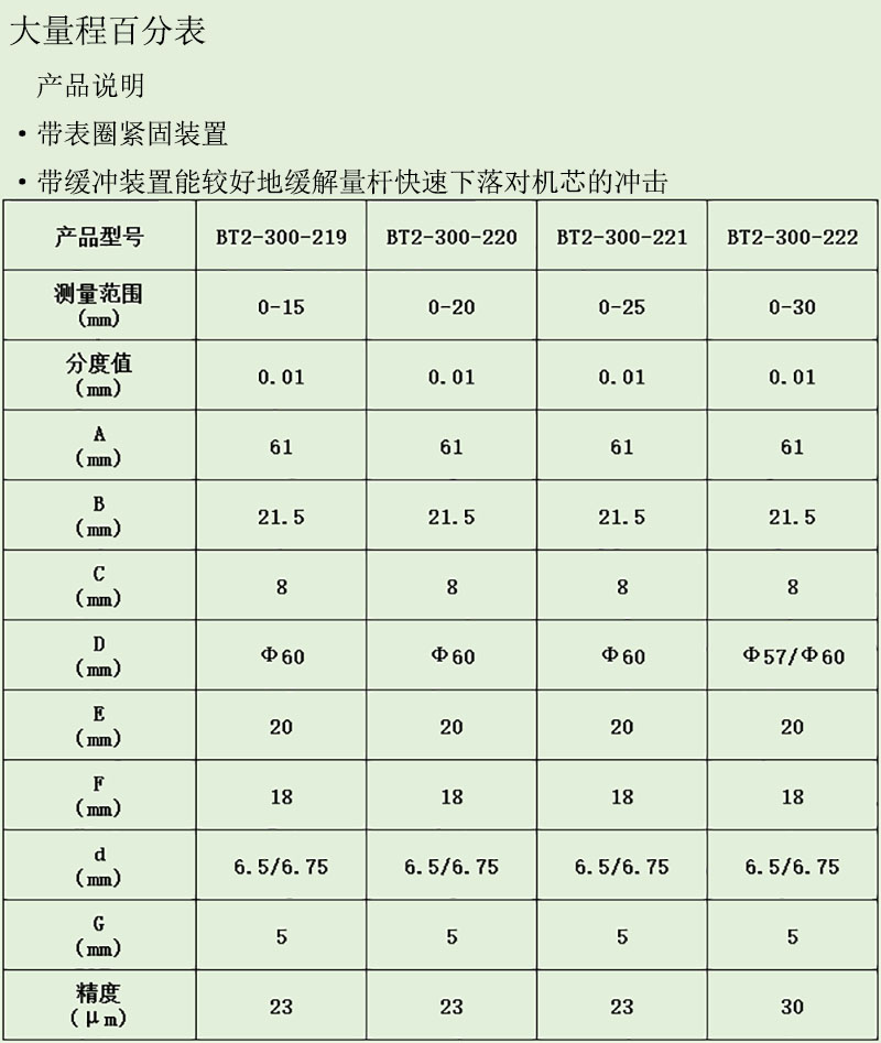 1 baty/贝迪 BT2-300-220大量程百分表具有0~20mm的测量范围,分度值为0.01mm,精度达到23μm,确保了高精度的测量需求。