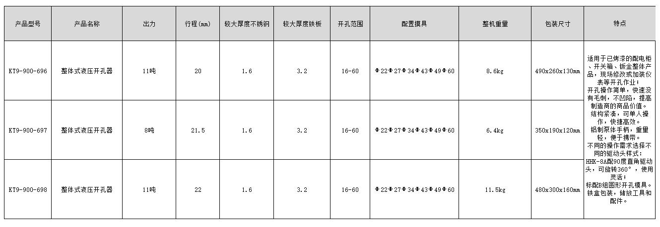 出力高达11吨,行程为22mm,适用于多种厚度的材料开孔,最大厚度可达1.6mm不锈钢和3.2mm铁板。