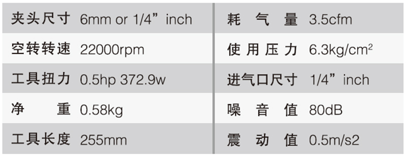 高效动力:空转转速高达22000rpm,工具扭力为0.5hp(372.9w),确保在各种材料加工中提供强劲的动力。