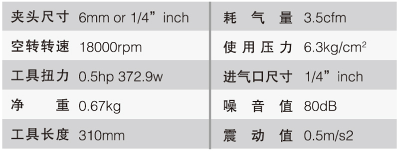 耗气量为3.5cfm,使用压力为6.3kg/cm²,进气口尺寸为1/4英寸,保证了充足的气流供应,提升工作效率。