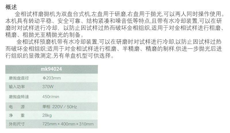 磨抛盘直径为Φ203mm,适用于各种尺寸的金相试样制备。
