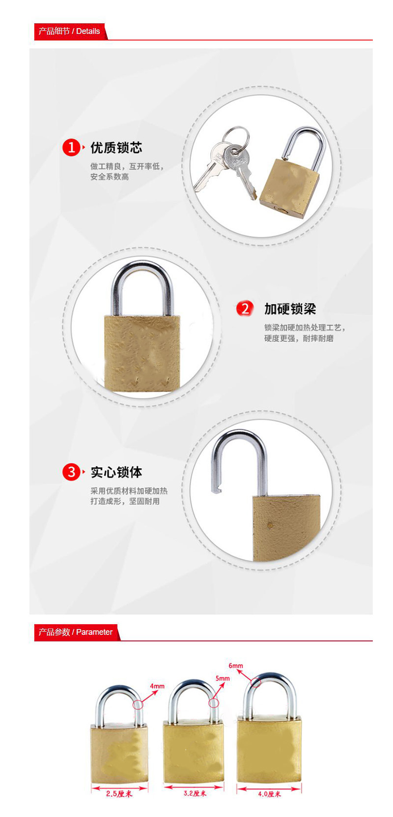 2 加硬锁梁:锁梁采用加硬加热处理工艺,硬度更强,耐摔耐磨,能够在恶劣环境下保持稳定性能。