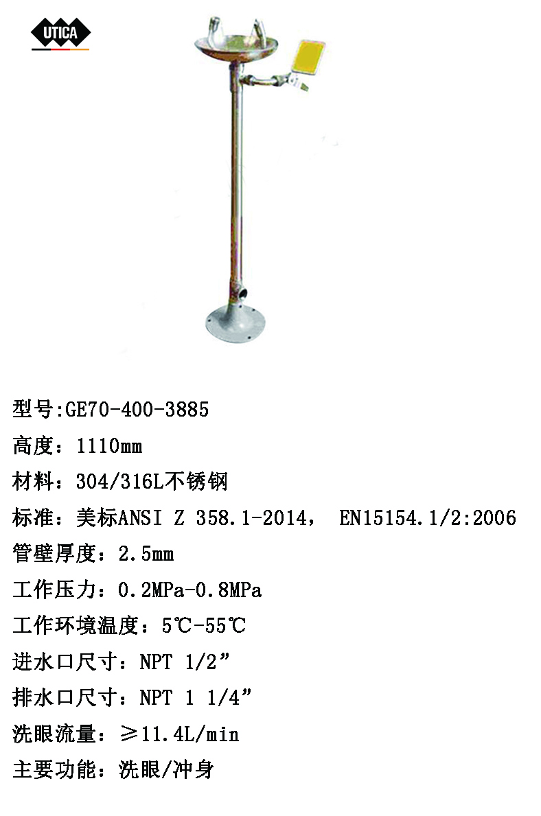 UTICA/优迪佧 不锈钢立式洗眼器 DAAO GE70-400-3885具有以下特点: