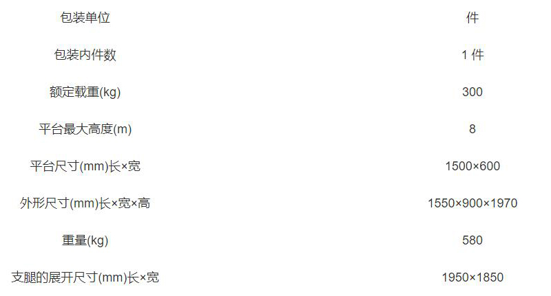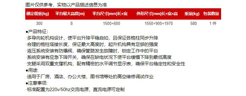 额定载重300kg,平台最大高度8米,满足多种高空作业需求,广泛适用于厂房、酒店、办公大楼等场所。