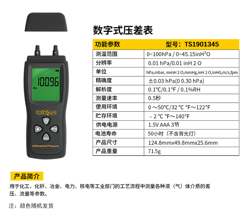 talboys/塔尔博伊斯 高精度数显数字式压差表 0~100hPa TS1901345