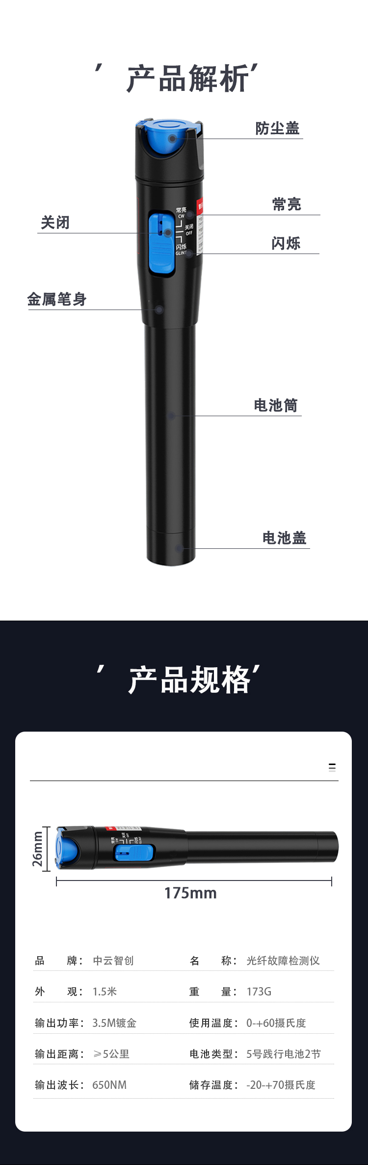 中云智创红光光纤测试笔1mW镭射红光笔5公里通光笔