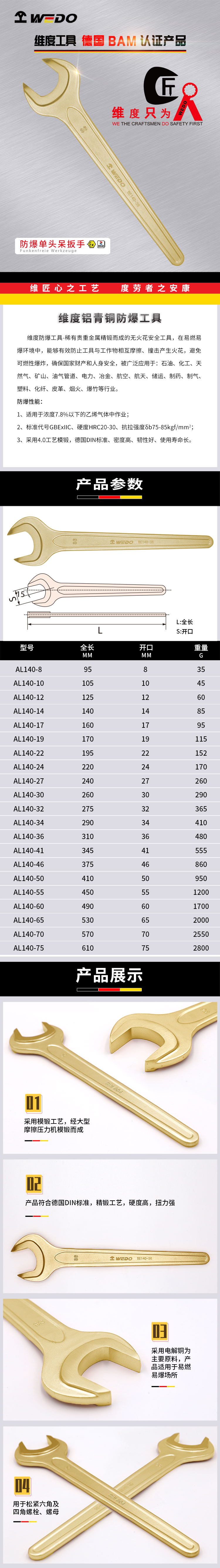WEDO(维度) 防爆铝青铜单头呆扳手 AL140-24具有以下特点: