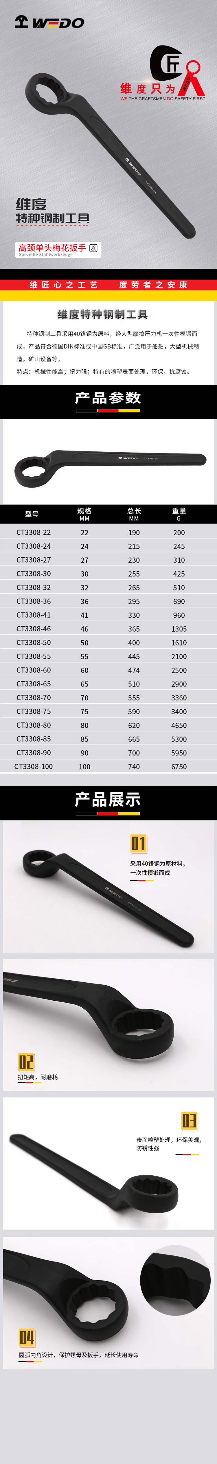 WEDO(维度) 高颈单头梅花扳手 CT3308-46具有以下特点: