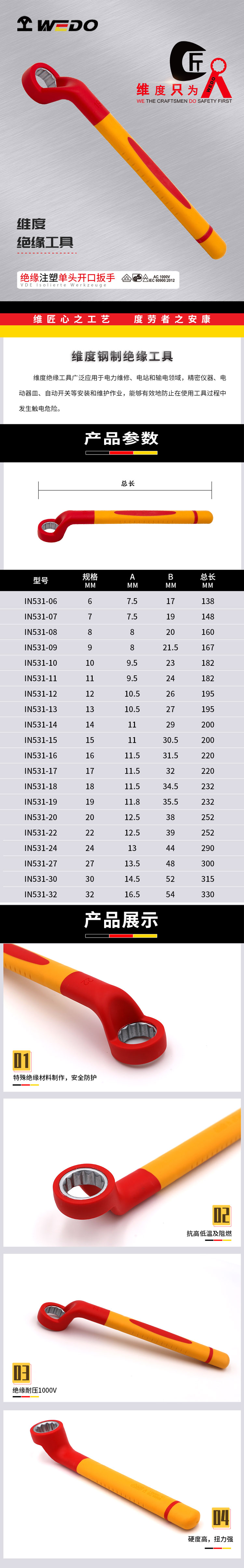 WEDO(维度) 绝缘注塑单头高颈梅花扳手 IN531-24具有以下特点: