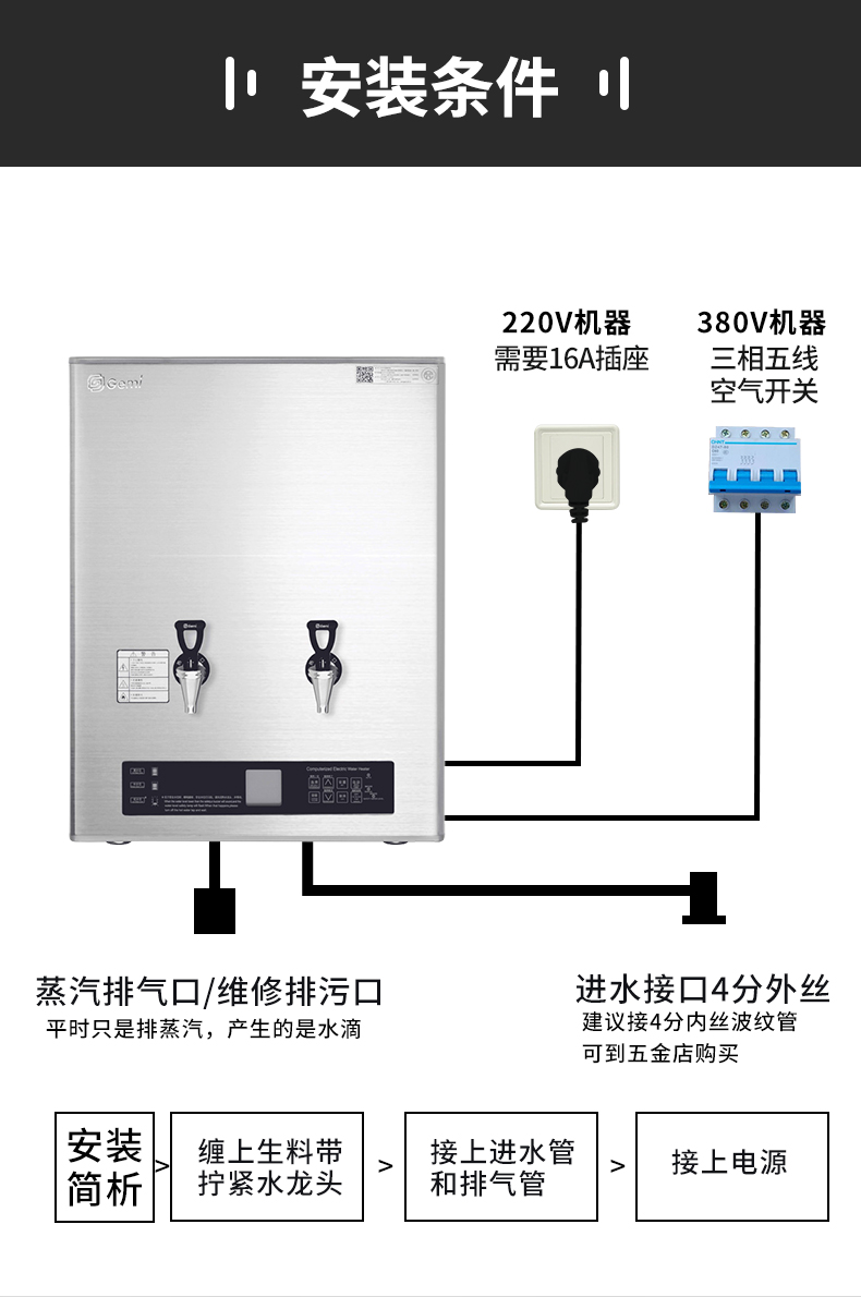 安装前请确认电源电压与设备匹配:本型号为220V/3KW,需接入16A插座;若选用三相供电版本则需380V/32A空气开关。