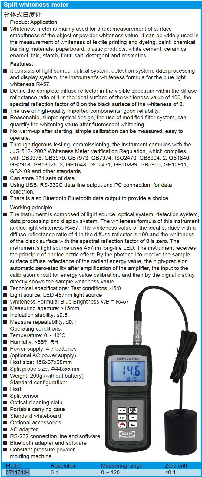 KENTA(克恩达) 手持数字式分体式白度仪 KT7-171-194 具有以下特点: